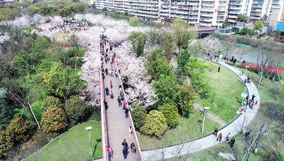 通过对场地的整体改造提升,从景观天桥的构造、滨水岸线的细致处理、地铁上部构筑物的美化利用、亲水步道、汀步以及亲水平台等共同营造了公园的赏樱五式:“路沿扶樱”、“眺水观樱”、“依木赏樱”、“揽桥闻樱”、“夜畔听樱”,带给游人多重赏樱体验,感受桥下浅深水,两间红白花的美景。